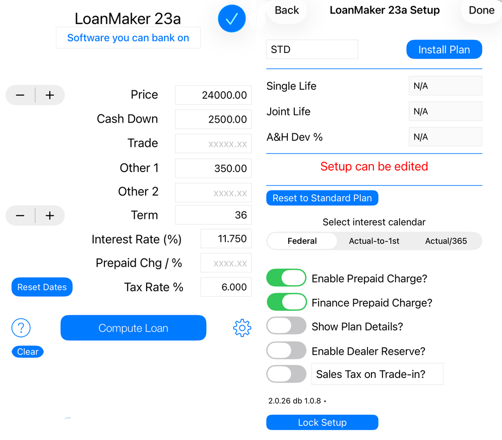 Instant calculations, full Truth-in-Lending disclosure, Dealer Reserve (Participation) calculations included.